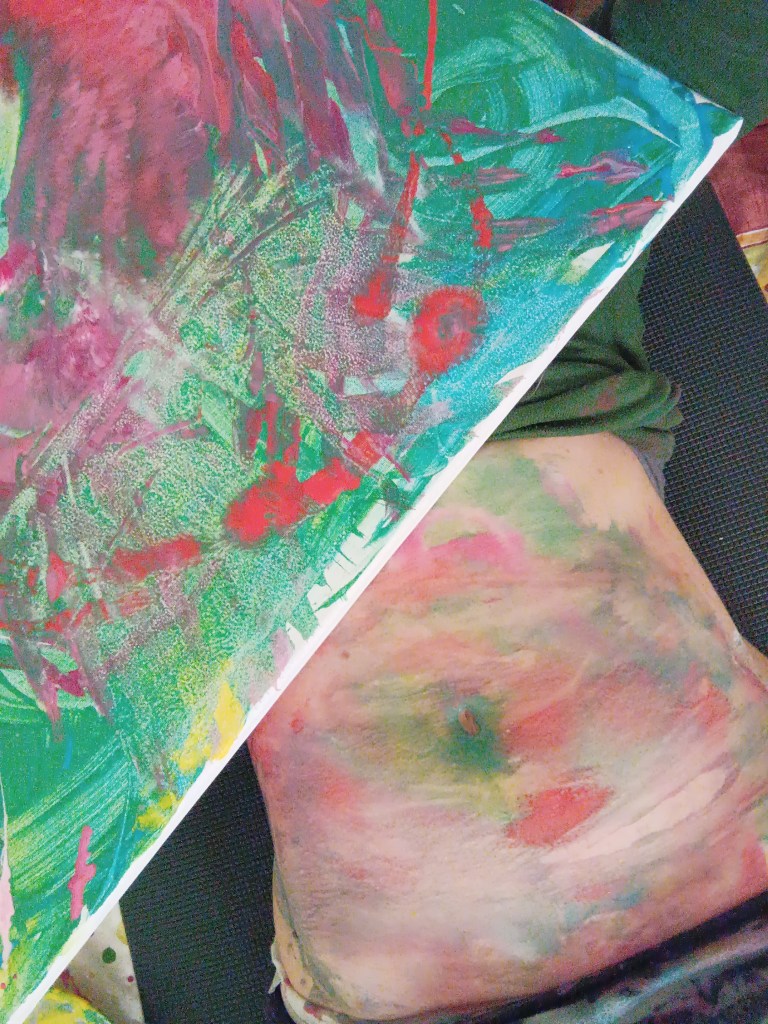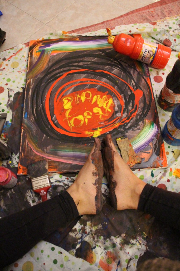 Aprendo la mia pagina facebook vedo un post che pubblicizzava un webinar di pittura intuitiva. Non sapevo assolutamente cosa fosse, ma mi incuriosiva molto, poiché non occorreva saper dipingere, mi sono iscritta senza nessuna aspettativa. Dopo le due ore di webinar ero così entusiasta e affascinata e meravigliata da questa esperienza, che ho deciso di iscrivermi al corso di pittura intuitiva, è così che faccio la conoscenza della mia guida di pittura dell’anima, Marianne Cordier. Mi sono ritrovata catapultata nel mondo dei colori, la mia anima era rapita dalla tela, è stato strabiliante. La meraviglia che ho provato mettendo le mani e i piedi nei colori (e dico letteralmente) è inspiegabile, mi sono sentita viva.